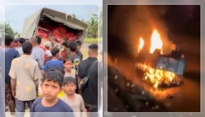 Aceh Utara, Aceh – Sebuah truk milik Satpol PP/Wilayatul Hisbah (WH) Aceh Utara mengalami kecelakaan dan terbakar saat mengantar bantuan logistik untuk korban banjir di wilayah terisolir Dusun Sarah Raja, Leubok Pusaka, Kecamatan Langkahan, Kabupaten Aceh Utara.